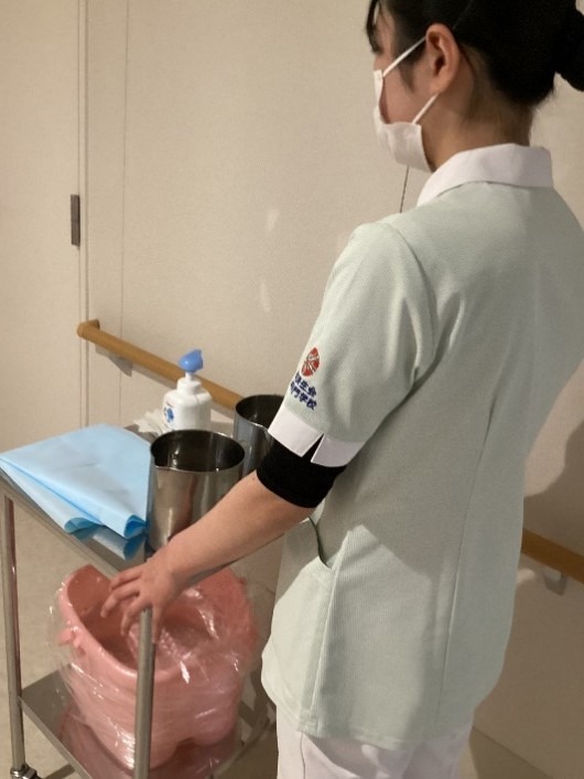 ケア(足浴)の準備を整え、患者さんのところへ向かっています。